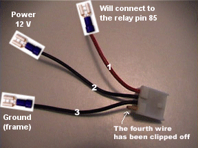 2. Now when you are done shopping it is time for some prep-work. Cut 5 pieces of 12 guage wire (the thicker one) about 8" each. On three of those wires, crimp 12 guage female quick connectors to both side. Crimp one 12 gauge female and one 12 gauge male connectors to the forth wire. Crimp the 12 gauge female connector and a 12 gauge ring connector to the fifth wire. You just made a wiring harness for your relay. Your will use these wires as follows: