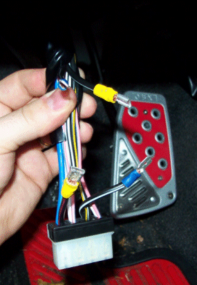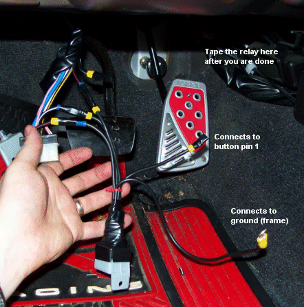 13. You are ready to put your car back together. I attached the relay with some electric tape to the right of the gas pedal (see few pictures above). Put the steering column covers back together. Then attach the your new button to the floppy connector - make sure you connect it to the three pins on the right: