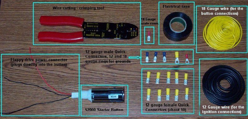 While you are in the store buying a relay, you can also pick up some 12 and 18 gauge wire, 12 and 18 gauge quick connectors (male and female), and 12 and 18 guage ring connectors (for grounding). Make sure you have a crimping and a wire stripping tool and some electrical tape. Last thing that you need to find is a floppy drive power connector. It is just a coincident but it fits perfectly in the back of the button. It will provide a quick "harness" to plug into your button. An alternative is to cut the white plastic around the button connector and solder some 18 gauge wires on three of the connections that are used. If you find a floppy drive power plug you don't have to do it and you can easily disconnect the button later.